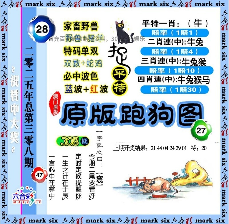 | 308期 | 牛 | 蓝双 | 7尾 | 开兔39 |
